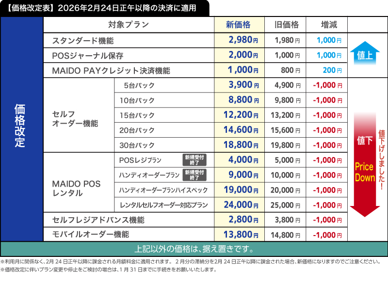 すでに、ご案内の通り、2026年2月24日正午以降に、お支払い頂く全ての費用について上記「新料金」を適用させて頂きます。