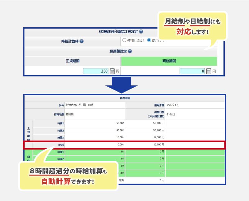 本機能を活用することで、1日8時間を超過する勤務の残業給計算の効率化が可能です。