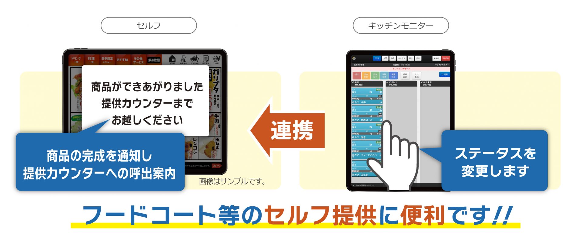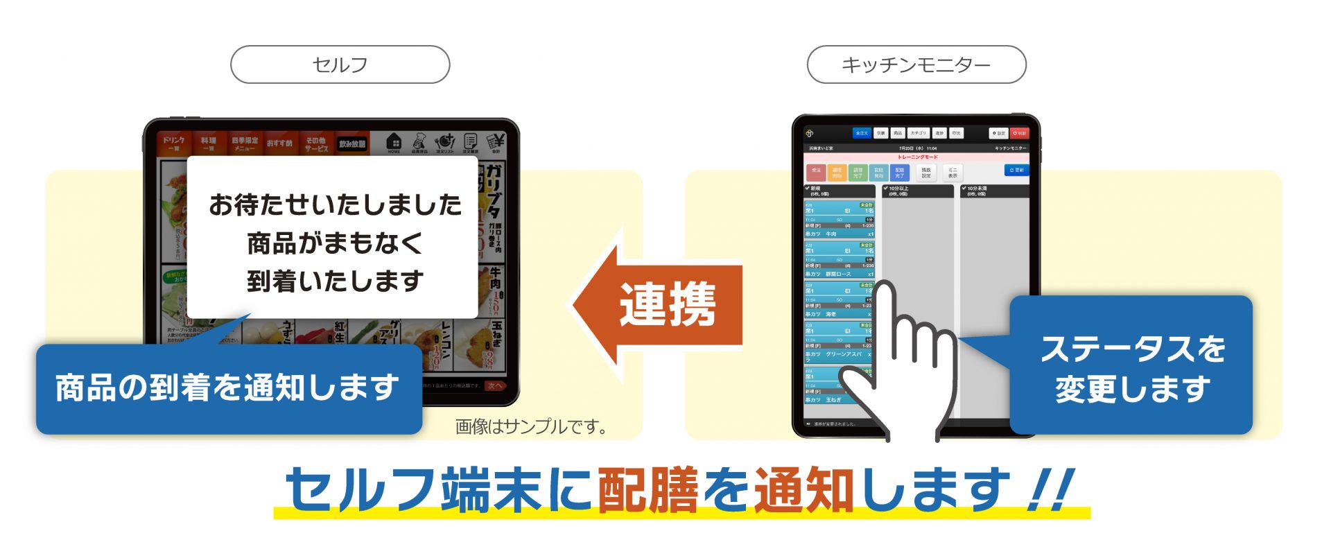 キッチンモニターのステータス切替に応じて「配膳通知」を、セルフオーダー端末に表示できます。「配膳通知」コメントは、お店のオペレーションにあわせて自由に設定できます。