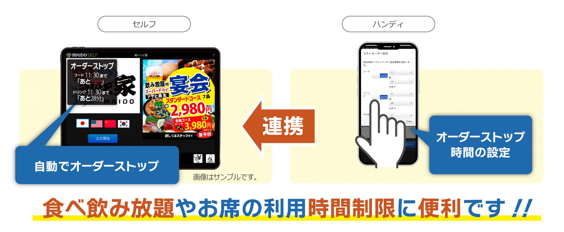 ハンディ端末で「オーダーストップ時間」を設定することで、当該座席のセルフオーダー端末からの注文を自動でストップさせる機能です。「ドリンクオーダーストップ」「フードオーダーストップ」を個別に時間設定できます。また、セルフオーダー端末のHOME画面にタイマーが表示されるので、「飲み食べ放題」や「お席の利用時間指定」などに活用いただけます。