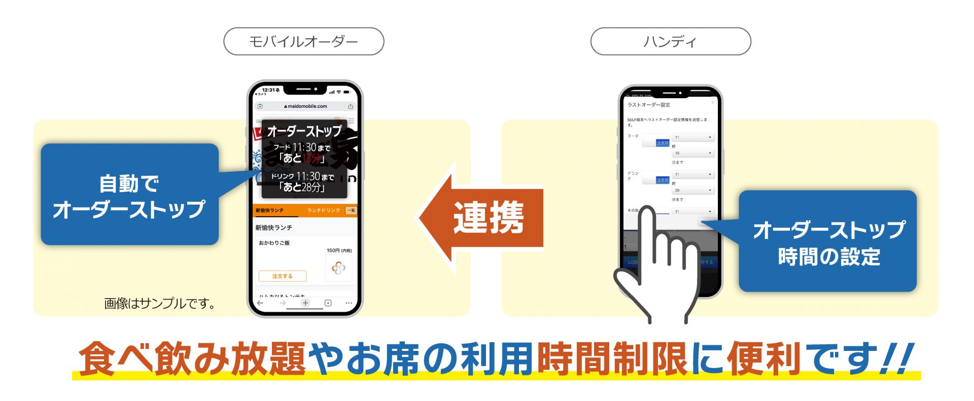 ハンディ端末で「オーダーストップ時間」を設定することで、当該座席のモバイルオーダー端末からの注文を自動でストップさせる機能です。「ドリンクオーダーストップ」「フードオーダーストップ」を個別に時間設定できます。また、モバイルオーダー端末のHOME画面にタイマーが表示されるので、「飲み食べ放題」や「お席の利用時間指定」などに活用いただけます。