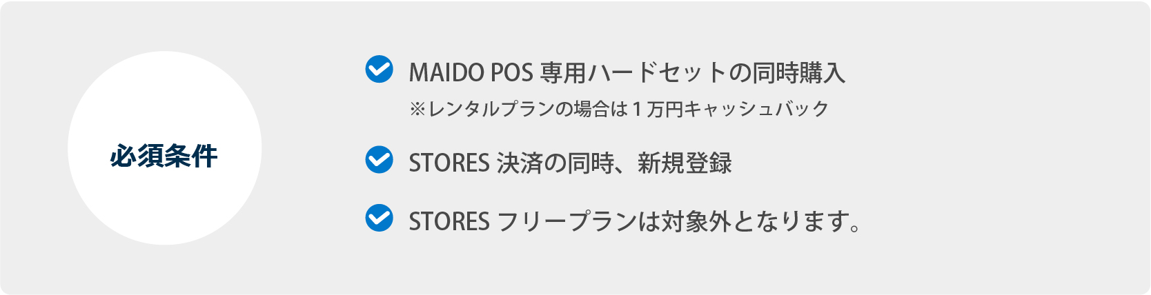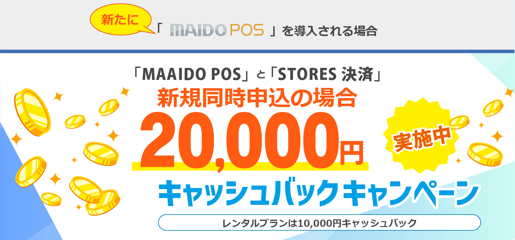 MAIDO POS 専用ハードセットと STORES 決済 を新規で同時導入の場合、2万円(レンタルの場合は1万円)をキャッシュバックさせていただきます。