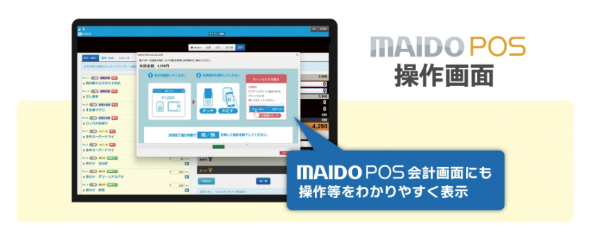 従業員側の「MAIDO POS」会計画面にもわかりやすく操作方法が表示されますので、複雑なキャッシュレス決済操作から解放され、また金額や操作ミスが無くなります。