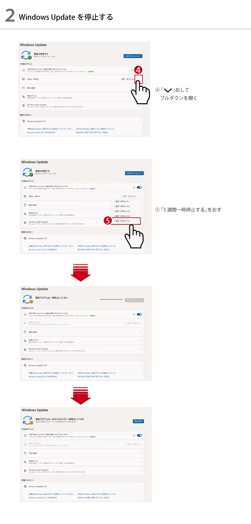以下の手順で、Windows更新を一時的に停止してください。